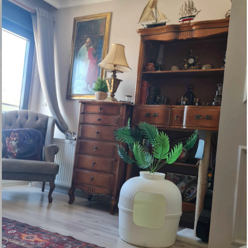 VetriHome, kedi tuvaletini şık bir saksı görünümüyle gizleyerek ev dekorasyonuna uyum sağlar.